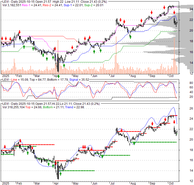 Price has closed below its short-term moving average. Short-term moving average is currently below mid-term; and above long-term moving average. From the relationship between price and moving averages: This stock is BEARISH in short-term; and NEUTRAL in mid-long term.[ LEVI ] has closed above bottom band by 14.3%. Bollinger Bands are 119.3% wider than normal. The large width of the bands suggest high volatility as compared to its normal range. The bands have been in this wide range for 3 days. This is a sign that the current trend might continue.