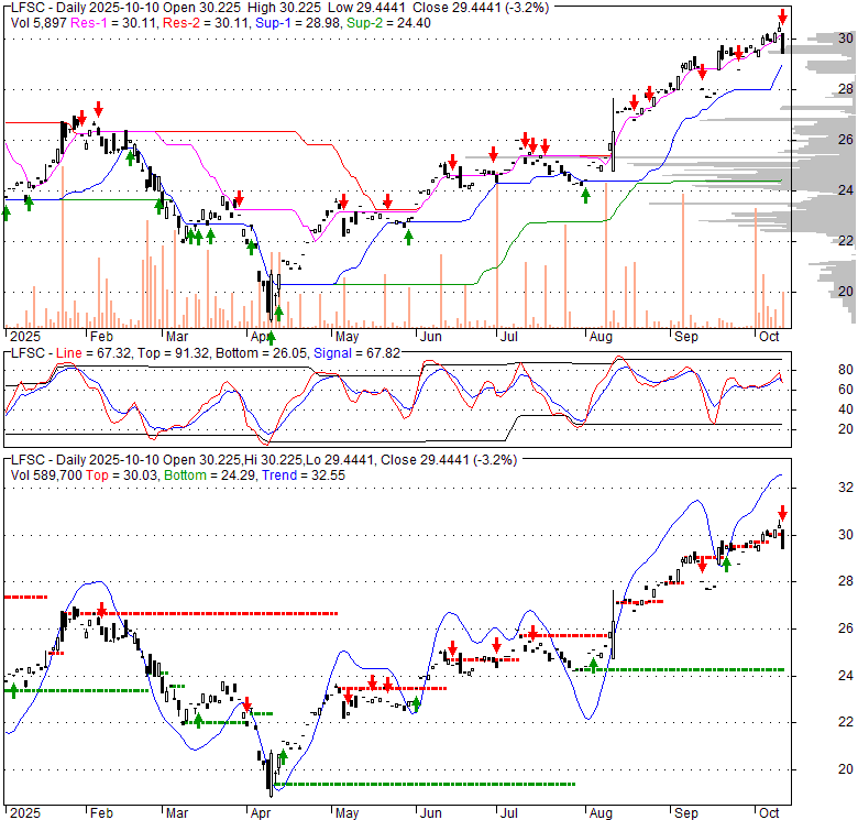 Price has closed below its short-term moving average. Short-term moving average is currently above mid-term; and above long-term moving average. From the relationship between price and moving averages: This stock is NEUTRAL in short-term; and BULLISH in mid-long term.[ LFSC ] has closed above bottom band by 45.8%. Bollinger Bands are 24.8% narrower than normal. The current width of the bands does not suggest anything about the future direction or movement of prices.