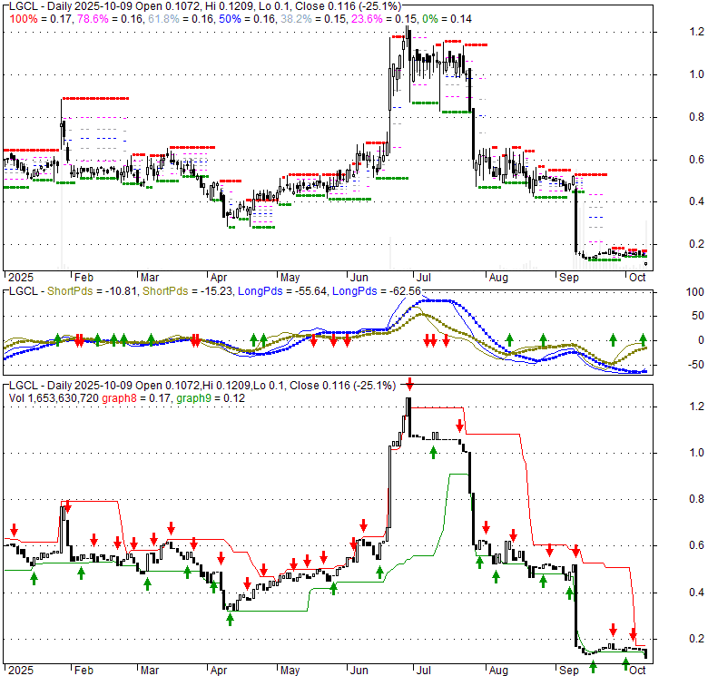 Price has closed below its short-term moving average. Short-term moving average is currently below mid-term; and below long-term moving average. From the relationship between price and moving averages: This stock is BEARISH in short-term; and BEARISH in mid-long term.[ LGCL ] has closed below the lower bollinger band by 28.8%. If price is in a downtrend band; this downward trend might continue. However a short term pullback inside the band is likely. Bollinger Bands are 85.7% narrower than normal. The narrow width of the bands suggests low volatility as compared to its normal range. The bands have been in this narrow range for 7 bars. This is a sign that the market may be about to initiate a new trend.