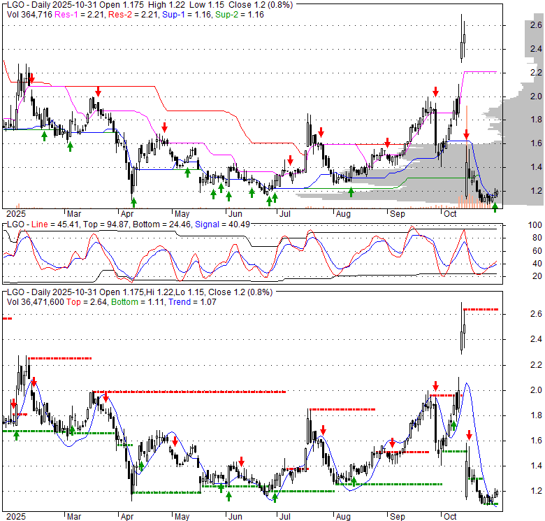 Price has closed above its short-term moving average. Short-term moving average is currently below mid-term; and below long-term moving average. From the relationship between price and moving averages: This stock is NEUTRAL in short-term; and NEUTRAL in mid-long term.[ LGO ] has closed above bottom band by 39.5%. Bollinger Bands are 226.6% wider than normal. The large width of the bands suggest high volatility as compared to its normal range. The bands have been in this wide range for 30 days. This is a sign that the current trend might continue.