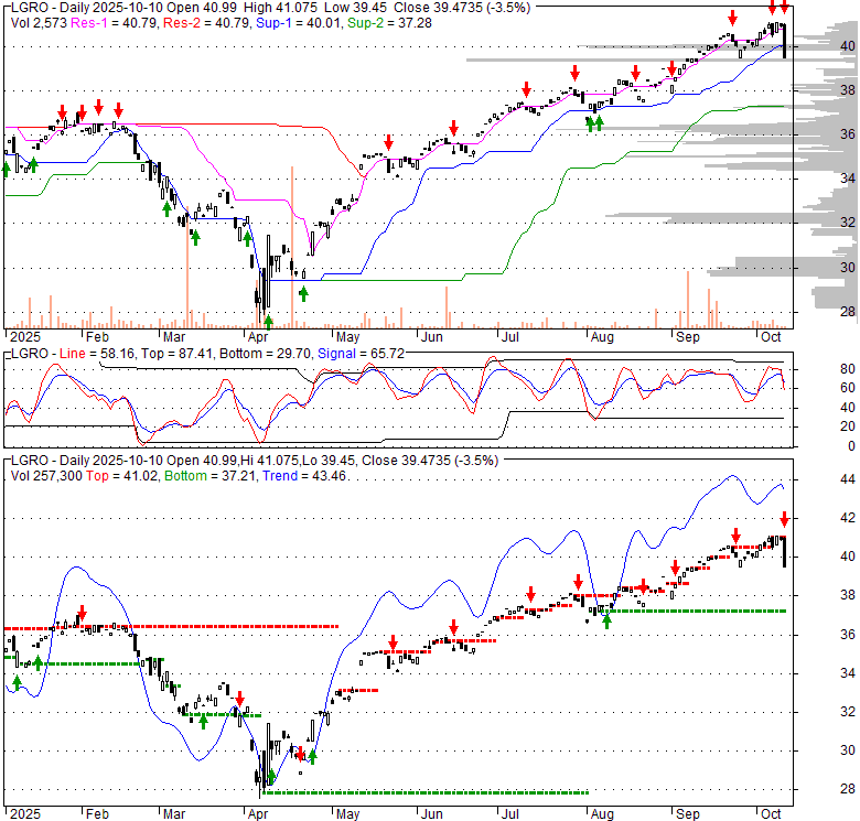 Price has closed below its short-term moving average. Short-term moving average is currently above mid-term; and above long-term moving average. From the relationship between price and moving averages: This stock is NEUTRAL in short-term; and BULLISH in mid-long term.[ LGRO ] has closed above bottom band by 6.7%. Bollinger Bands are 9% narrower than normal. The current width of the bands does not suggest anything about the future direction or movement of prices.