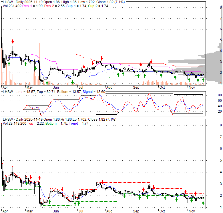 Price has closed above its short-term moving average. Short-term moving average is currently below mid-term; and below long-term moving average. From the relationship between price and moving averages: This stock is NEUTRAL in short-term; and BEARISH in mid-long term.[ LHSW ] has closed below upper band by 41.5%. Bollinger Bands are 43.4% narrower than normal. The narrow width of the bands suggests low volatility as compared to its normal range. The bands have been in this narrow range for 1 bars. This is a sign that the market may be about to initiate a new trend.