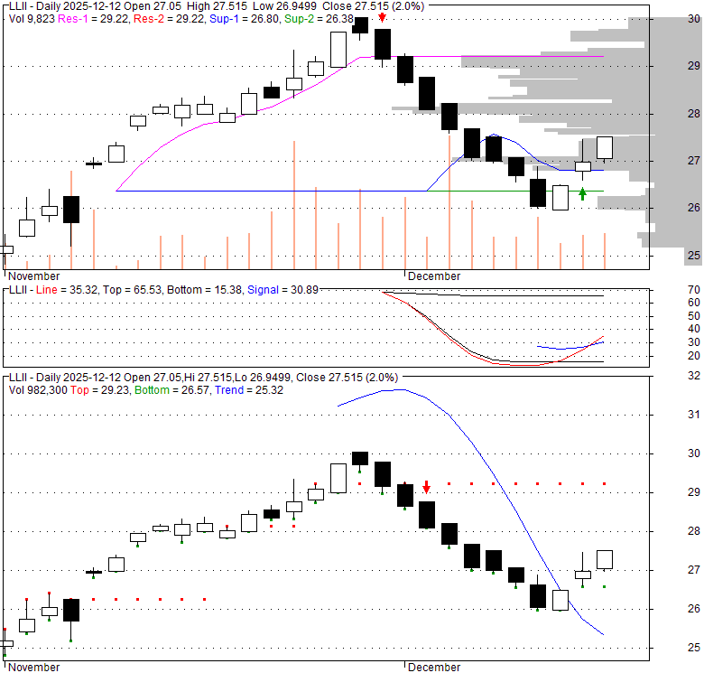 Price has closed above its short-term moving average. Short-term moving average is currently below mid-term; and below long-term moving average. From the relationship between price and moving averages: This stock is NEUTRAL in short-term; and NEUTRAL in mid-long term.[ LLII ] has closed above bottom band by 41.5%. Bollinger Bands are 0% narrower than normal.