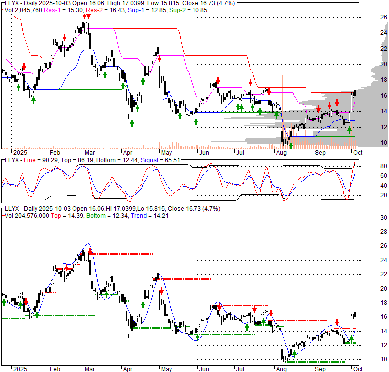 Price has closed above its short-term moving average. Short-term moving average is currently above mid-term; and above long-term moving average. From the relationship between price and moving averages: This stock is BULLISH in short-term; and NEUTRAL in mid-long term.[ LLYX ] has closed above the upper band by 3.7%. If price is in a uptrend band; this upward trend in price might continue. However a short term pullback inside the band is likely.Bollinger Bands are 26.6% wider than normal. The current width of the bands does not suggest anything about the future direction or movement of prices.