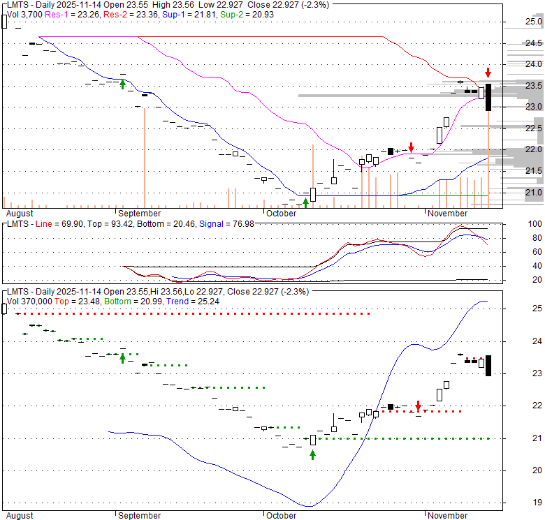 Price has closed below its short-term moving average. Short-term moving average is currently above mid-term; and below long-term moving average. From the relationship between price and moving averages: This stock is NEUTRAL in short-term; and NEUTRAL in mid-long term.[ LMTS ] has closed below upper band by 37.1%. Bollinger Bands are 0% narrower than normal.