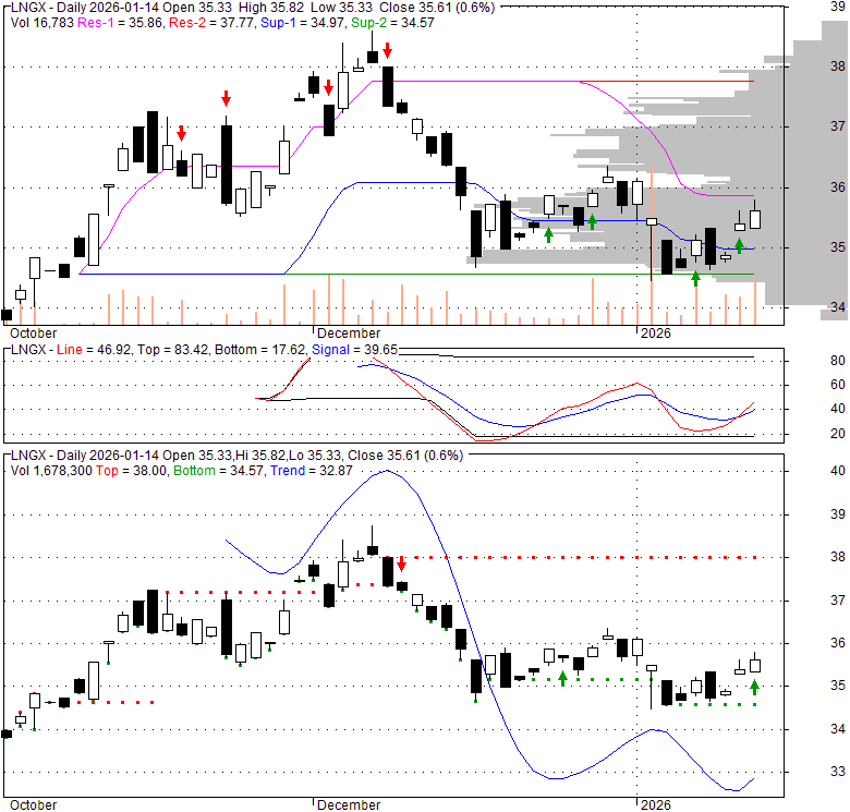 Price has closed above its short-term moving average. Short-term moving average is currently below mid-term; and below long-term moving average. From the relationship between price and moving averages: This stock is NEUTRAL in short-term; and NEUTRAL in mid-long term.[ LNGX ] has closed below upper band by 40.5%. Bollinger Bands are 0% narrower than normal.