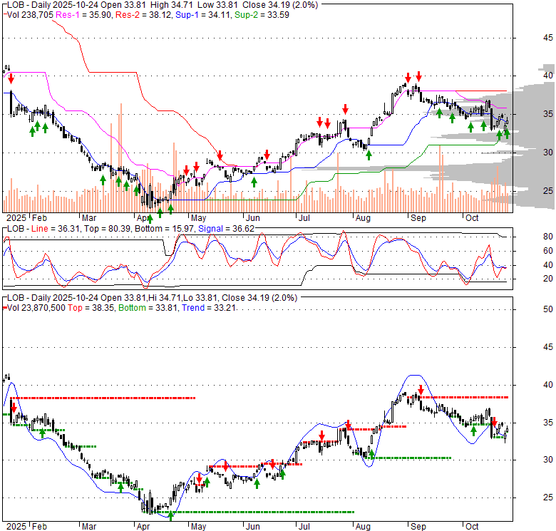 Price has closed above its short-term moving average. Short-term moving average is currently below mid-term; and above long-term moving average. From the relationship between price and moving averages: This stock is NEUTRAL in short-term; and NEUTRAL in mid-long term.[ LOB ] has closed above bottom band by 39.2%. Bollinger Bands are 1% wider than normal. The current width of the bands does not suggest anything about the future direction or movement of prices.