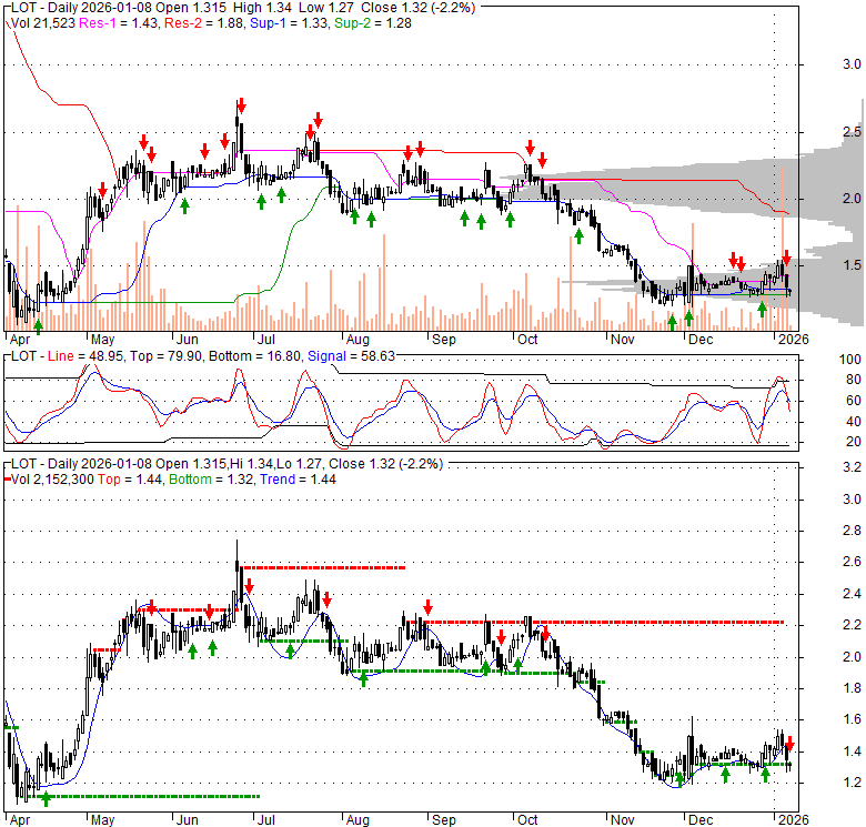 Price has closed below its short-term moving average. Short-term moving average is currently above mid-term; and below long-term moving average. From the relationship between price and moving averages: This stock is NEUTRAL in short-term; and NEUTRAL in mid-long term.[ LOT ] has closed above bottom band by 22.3%. Bollinger Bands are 34.7% narrower than normal. The current width of the bands does not suggest anything about the future direction or movement of prices.