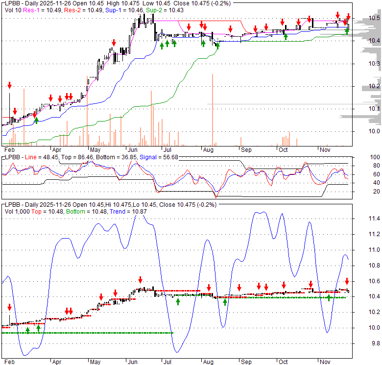 Price has closed below its short-term moving average. Short-term moving average is currently above mid-term; and above long-term moving average. From the relationship between price and moving averages: This stock is NEUTRAL in short-term; and BULLISH in mid-long term.[ LPBB ] has closed above bottom band by 43.2%. Bollinger Bands are 11% wider than normal. The current width of the bands does not suggest anything about the future direction or movement of prices.