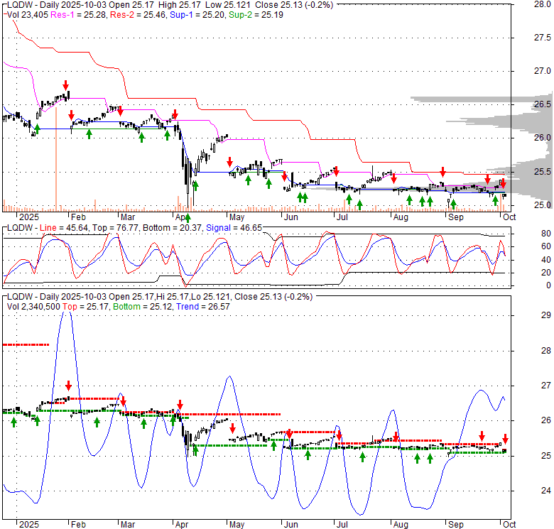 Price has closed below its short-term moving average. Short-term moving average is currently below mid-term; and below long-term moving average. From the relationship between price and moving averages: This stock is BEARISH in short-term; and BEARISH in mid-long term.[ LQDW ] has closed above bottom band by 1.9%. Bollinger Bands are 37% narrower than normal. The current width of the bands does not suggest anything about the future direction or movement of prices.