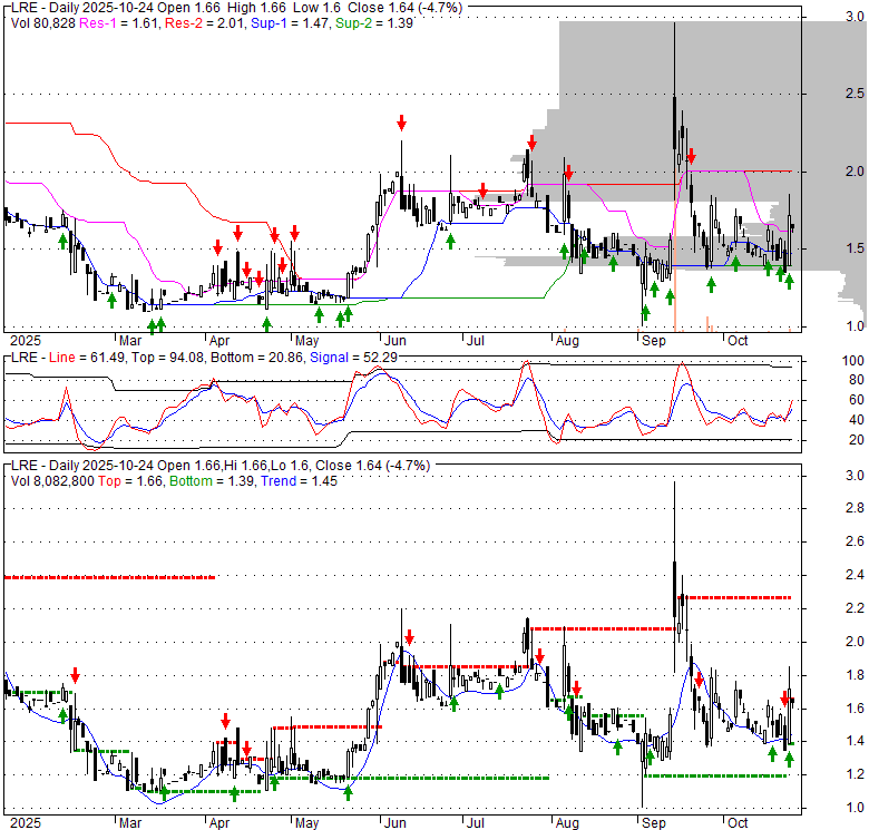 Price has closed above its short-term moving average. Short-term moving average is currently below mid-term; and below long-term moving average. From the relationship between price and moving averages: This stock is NEUTRAL in short-term; and BEARISH in mid-long term.[ LRE ] has closed below upper band by 27.2%. Bollinger Bands are 21.7% narrower than normal. The current width of the bands does not suggest anything about the future direction or movement of prices.