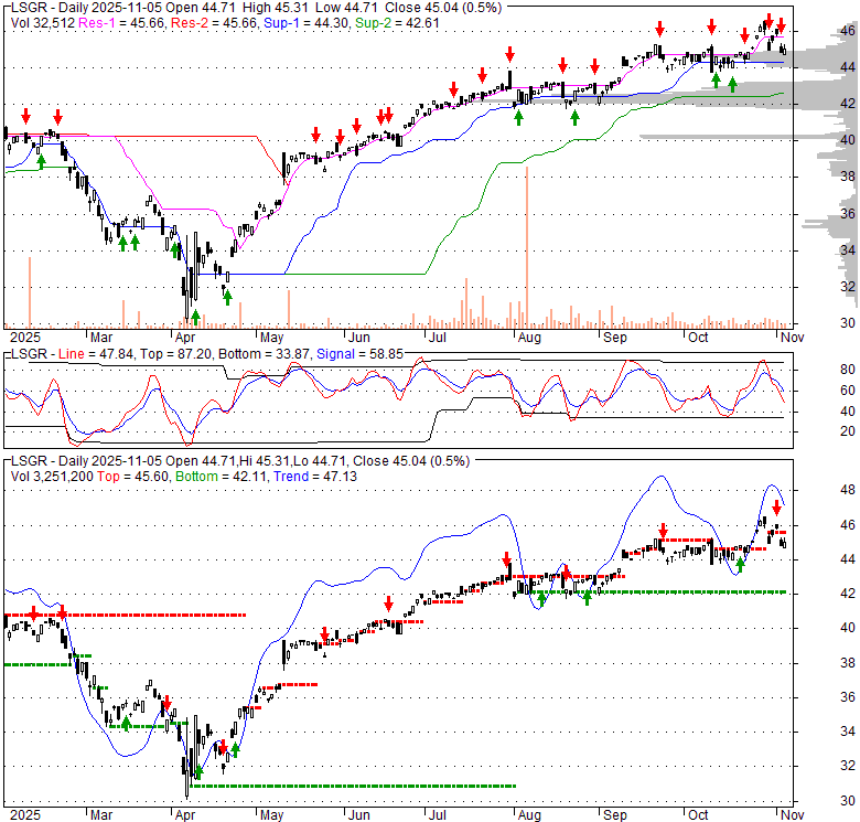 Price has closed below its short-term moving average. Short-term moving average is currently above mid-term; and above long-term moving average. From the relationship between price and moving averages: This stock is NEUTRAL in short-term; and BULLISH in mid-long term.[ LSGR ] has closed above bottom band by 47.0%. Bollinger Bands are 36.6% wider than normal. The current width of the bands does not suggest anything about the future direction or movement of prices.