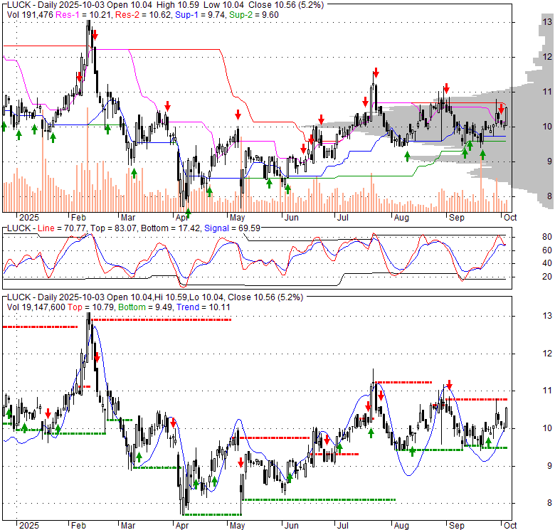 Price has closed above its short-term moving average. Short-term moving average is currently above mid-term; and above long-term moving average. From the relationship between price and moving averages: This stock is BULLISH in short-term; and BULLISH in mid-long term.[ LUCK ] has closed Bollinger Bands are 22.3% narrower than normal. The current width of the bands does not suggest anything about the future direction or movement of prices.