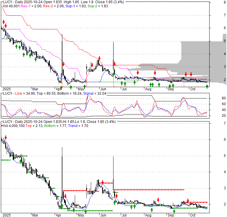 Price has closed above its short-term moving average. Short-term moving average is currently below mid-term; and below long-term moving average. From the relationship between price and moving averages: This stock is NEUTRAL in short-term; and BEARISH in mid-long term.[ LUCY ] has closed above bottom band by 37.2%. Bollinger Bands are 45% narrower than normal. The narrow width of the bands suggests low volatility as compared to its normal range. The bands have been in this narrow range for 73 bars. This is a sign that the market may be about to initiate a new trend.