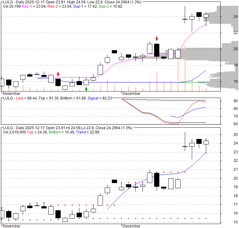 Price has closed above its short-term moving average. Short-term moving average is currently below mid-term; and below long-term moving average. From the relationship between price and moving averages: This stock is NEUTRAL in short-term; and NEUTRAL in mid-long term.[ LULG ] has closed below upper band by 1.1%. Bollinger Bands are 0% narrower than normal.