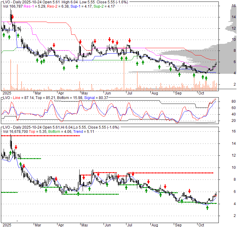 Price has closed above its short-term moving average. Short-term moving average is currently above mid-term; and below long-term moving average. From the relationship between price and moving averages: This stock is BULLISH in short-term; and NEUTRAL in mid-long term.[ LVO ] has closed below upper band by 6.3%. Bollinger Bands are 22.2% wider than normal. The current width of the bands does not suggest anything about the future direction or movement of prices.