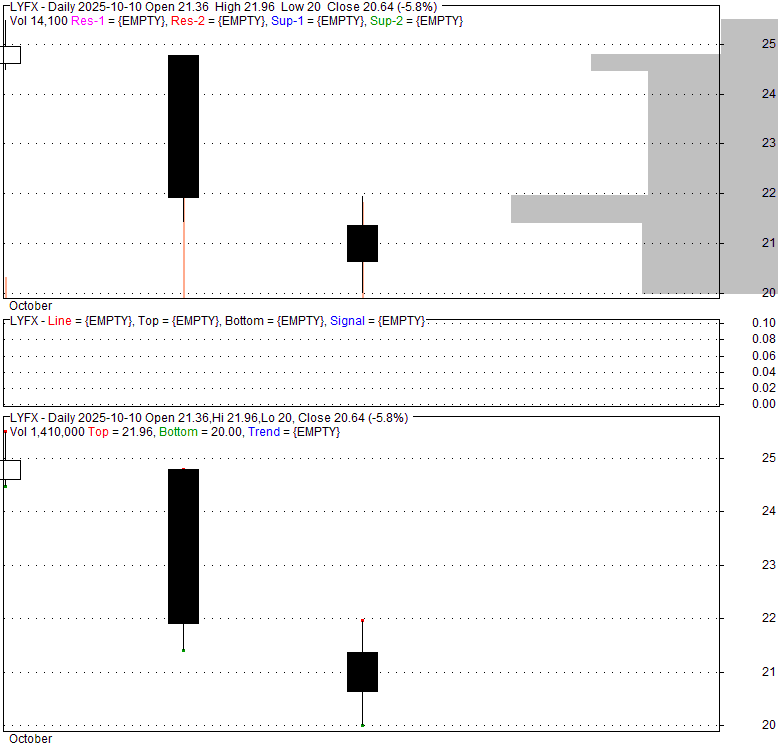 Price has closed below its short-term moving average. Short-term moving average is currently below mid-term; and below long-term moving average. From the relationship between price and moving averages: This stock is NEUTRAL in short-term; and NEUTRAL in mid-long term.[ LYFX ] has closed Bollinger Bands are 0% narrower than normal.