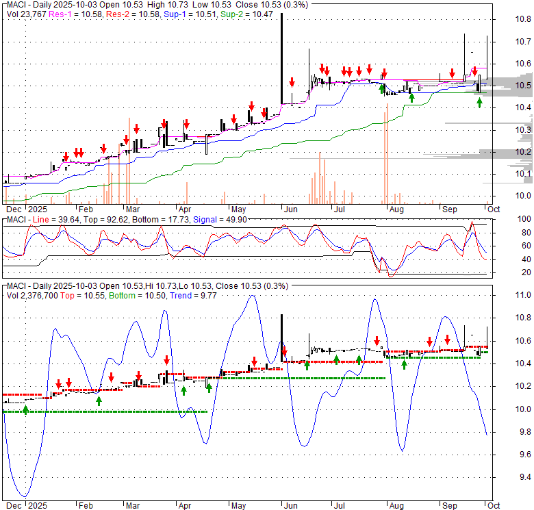 Price has closed above its short-term moving average. Short-term moving average is currently above mid-term; and above long-term moving average. From the relationship between price and moving averages: This stock is BULLISH in short-term; and BULLISH in mid-long term.[ MACI ] has closed above bottom band by 42.8%. Bollinger Bands are 0.4% narrower than normal. The current width of the bands does not suggest anything about the future direction or movement of prices.