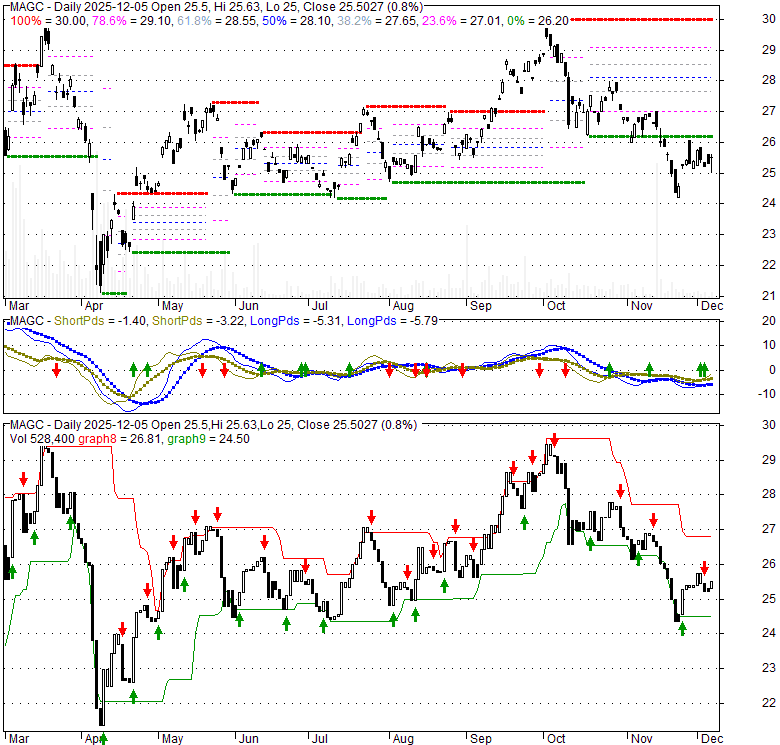 Price has closed above its short-term moving average. Short-term moving average is currently below mid-term; and below long-term moving average. From the relationship between price and moving averages: This stock is NEUTRAL in short-term; and NEUTRAL in mid-long term.[ MAGC ] has closed below upper band by 40.2%. Bollinger Bands are 30.7% narrower than normal. The current width of the bands does not suggest anything about the future direction or movement of prices.