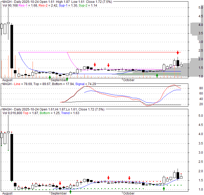 Price has closed above its short-term moving average. Short-term moving average is currently above mid-term; and below long-term moving average. From the relationship between price and moving averages: This stock is BULLISH in short-term; and NEUTRAL in mid-long term.[ MAGH ] has closed below upper band by 19.0%. Bollinger Bands are 0% narrower than normal.
