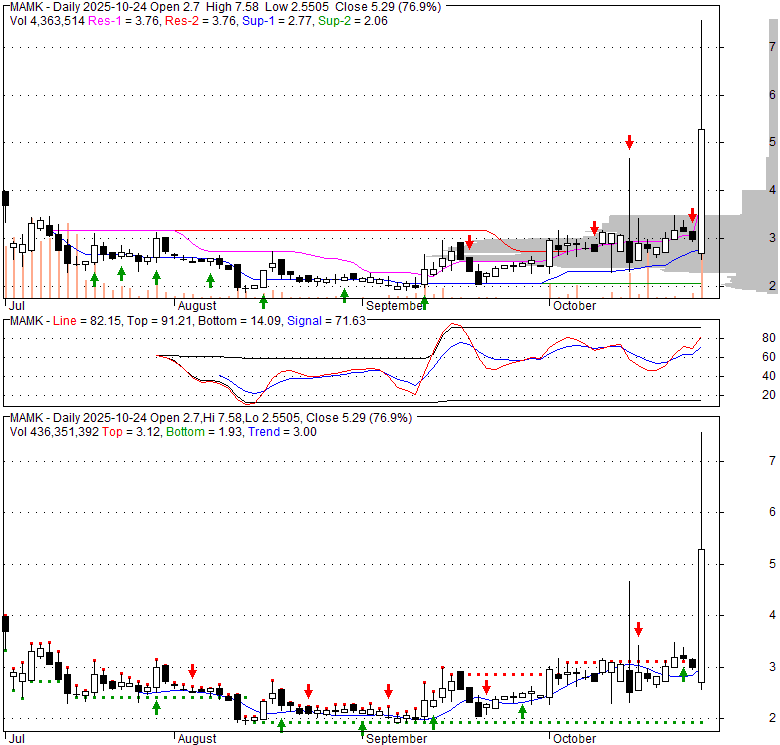Price has closed above its short-term moving average. Short-term moving average is currently above mid-term; and below long-term moving average. From the relationship between price and moving averages: This stock is BULLISH in short-term; and NEUTRAL in mid-long term.[ MAMK ] has closed above the upper band by 39.4%. If price is in a uptrend band; this upward trend in price might continue. However a short term pullback inside the band is likely.Bollinger Bands are 0% narrower than normal.