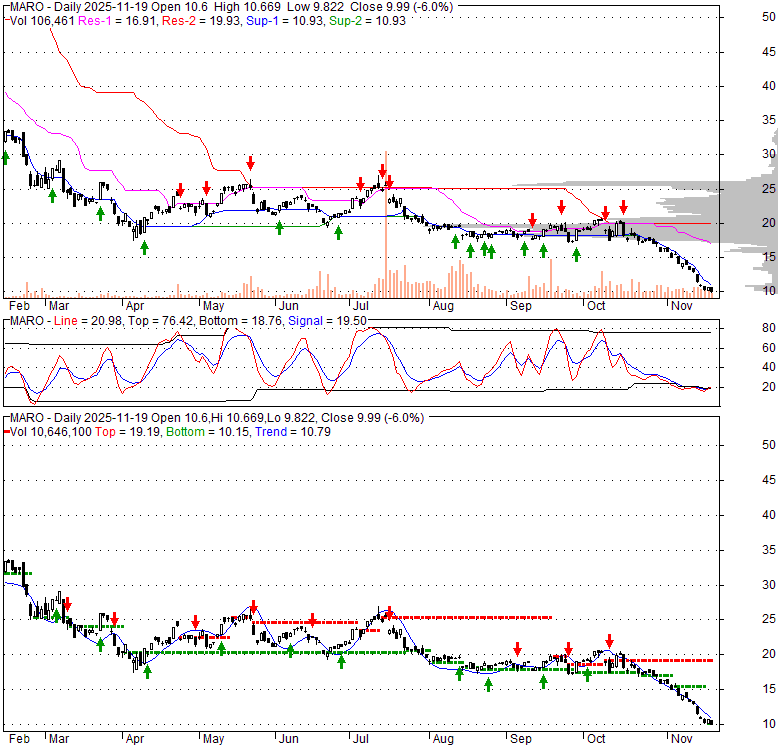 Price has closed below its short-term moving average. Short-term moving average is currently below mid-term; and below long-term moving average. From the relationship between price and moving averages: This stock is BEARISH in short-term; and BEARISH in mid-long term.[ MARO ] has closed above bottom band by 10.4%. Bollinger Bands are 105.4% wider than normal. The large width of the bands suggest high volatility as compared to its normal range. The bands have been in this wide range for 6 days. This is a sign that the current trend might continue.