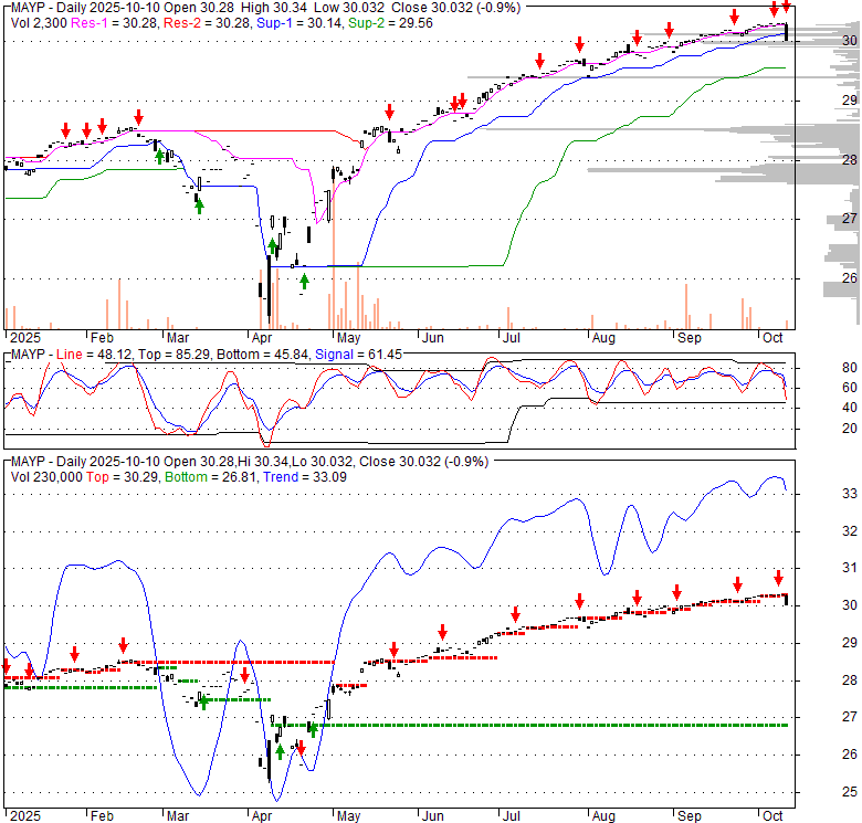 Price has closed below its short-term moving average. Short-term moving average is currently above mid-term; and above long-term moving average. From the relationship between price and moving averages: This stock is NEUTRAL in short-term; and BULLISH in mid-long term.[ MAYP ] has closed below the lower bollinger band by 9.6%. If price is in a downtrend band; this downward trend might continue. However a short term pullback inside the band is likely. Bollinger Bands are 37.8% narrower than normal. The current width of the bands does not suggest anything about the future direction or movement of prices.