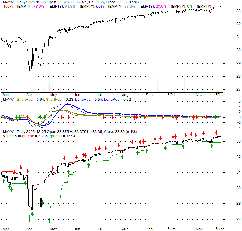 Price has closed above its short-term moving average. Short-term moving average is currently above mid-term; and above long-term moving average. From the relationship between price and moving averages: This stock is BULLISH in short-term; and BULLISH in mid-long term.[ MAYW ] has closed below upper band by 14.0%. Bollinger Bands are 36.7% narrower than normal. The current width of the bands does not suggest anything about the future direction or movement of prices.