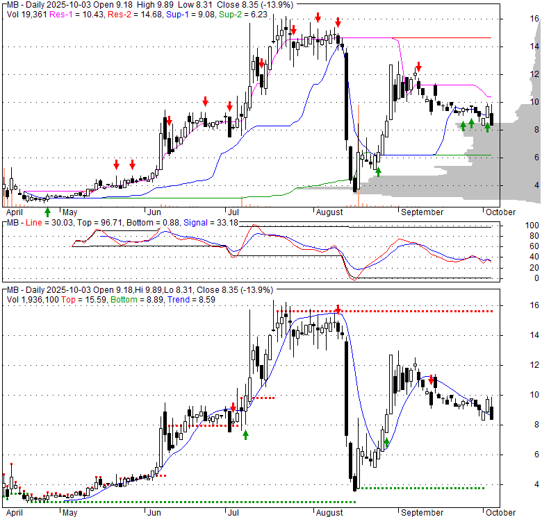 Price has closed below its short-term moving average. Short-term moving average is currently below mid-term; and below long-term moving average. From the relationship between price and moving averages: This stock is BEARISH in short-term; and NEUTRAL in mid-long term.[ MB ] has closed below the lower bollinger band by 7.3%. Although price has broken the lower band and a downside breakout is possible; the most likely direction for [ MB ] is to continue within current trading range. It is unclear right now based on current values. 67.4% narrower than normal. The narrow width of the bands suggests low volatility as compared to its normal range. The bands have been in this narrow range for {EMPTY} bars. This is a sign that the market may be about to initiate a new trend.