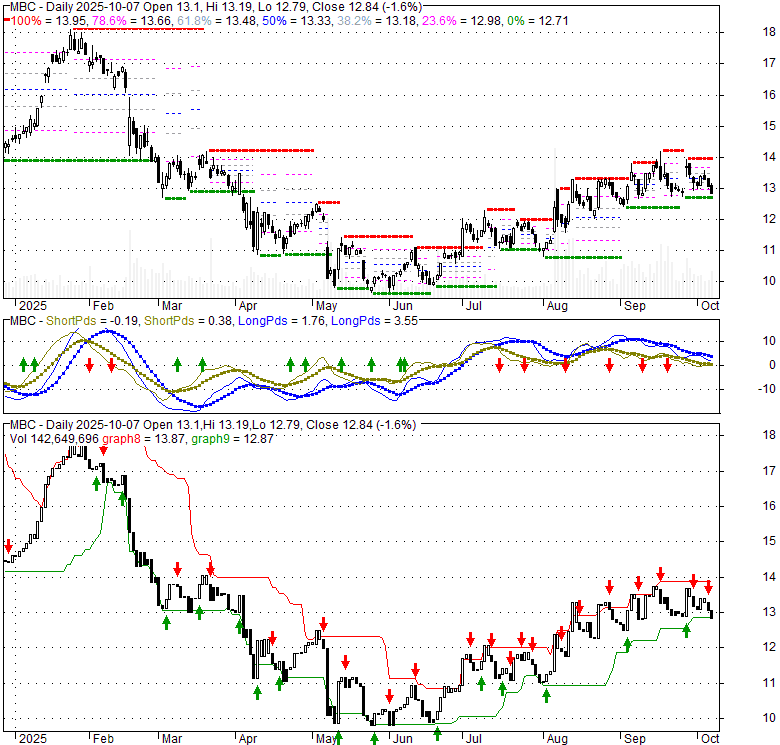 Price has closed below its short-term moving average. Short-term moving average is currently above mid-term; and above long-term moving average. From the relationship between price and moving averages: This stock is NEUTRAL in short-term; and BULLISH in mid-long term.[ MBC ] has closed above bottom band by 14.5%. Bollinger Bands are 44.9% narrower than normal. The narrow width of the bands suggests low volatility as compared to its normal range. The bands have been in this narrow range for 1 bars. This is a sign that the market may be about to initiate a new trend.