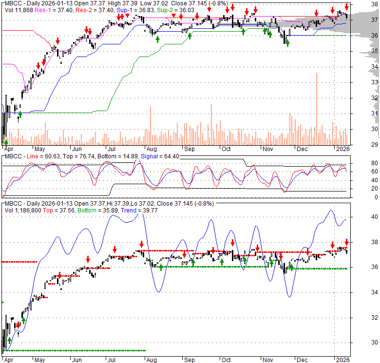 Price has closed below its short-term moving average. Short-term moving average is currently above mid-term; and above long-term moving average. From the relationship between price and moving averages: This stock is NEUTRAL in short-term; and NEUTRAL in mid-long term.[ MBCC ] has closed above bottom band by 41.1%. Bollinger Bands are 17.5% narrower than normal. The current width of the bands does not suggest anything about the future direction or movement of prices.