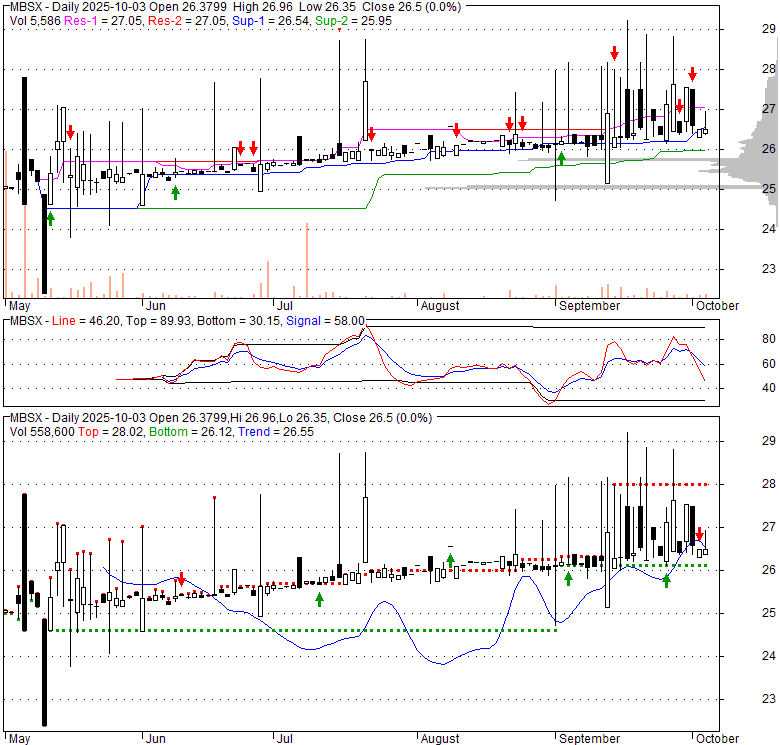 Price has closed below its short-term moving average. Short-term moving average is currently above mid-term; and above long-term moving average. From the relationship between price and moving averages: This stock is NEUTRAL in short-term; and BULLISH in mid-long term.[ MBSX ] has closed below upper band by 47.8%. Bollinger Bands are 0% narrower than normal.