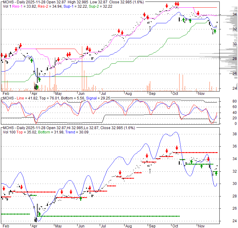 Price has closed above its short-term moving average. Short-term moving average is currently below mid-term; and below long-term moving average. From the relationship between price and moving averages: This stock is NEUTRAL in short-term; and NEUTRAL in mid-long term.[ MCHS ] has closed below upper band by 48.5%. Bollinger Bands are 43.8% wider than normal. The large width of the bands suggest high volatility as compared to its normal range. The bands have been in this wide range for 4 days. This is a sign that the current trend might continue.