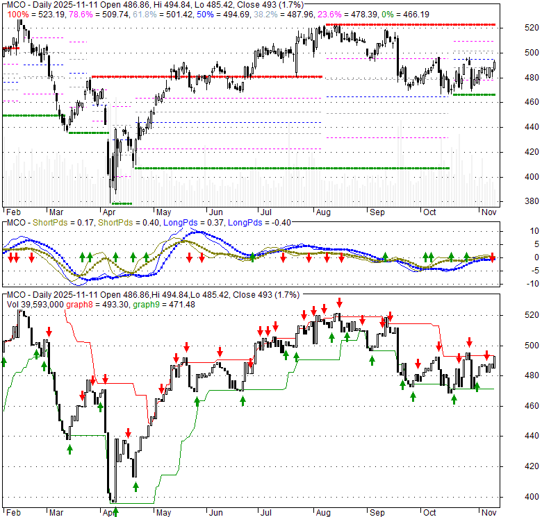 Price has closed above its short-term moving average. Short-term moving average is currently above mid-term; and below long-term moving average. From the relationship between price and moving averages: This stock is BULLISH in short-term; and NEUTRAL in mid-long term.[ MCO ] has closed below upper band by 18.3%. Bollinger Bands are 10.1% narrower than normal. The current width of the bands does not suggest anything about the future direction or movement of prices.