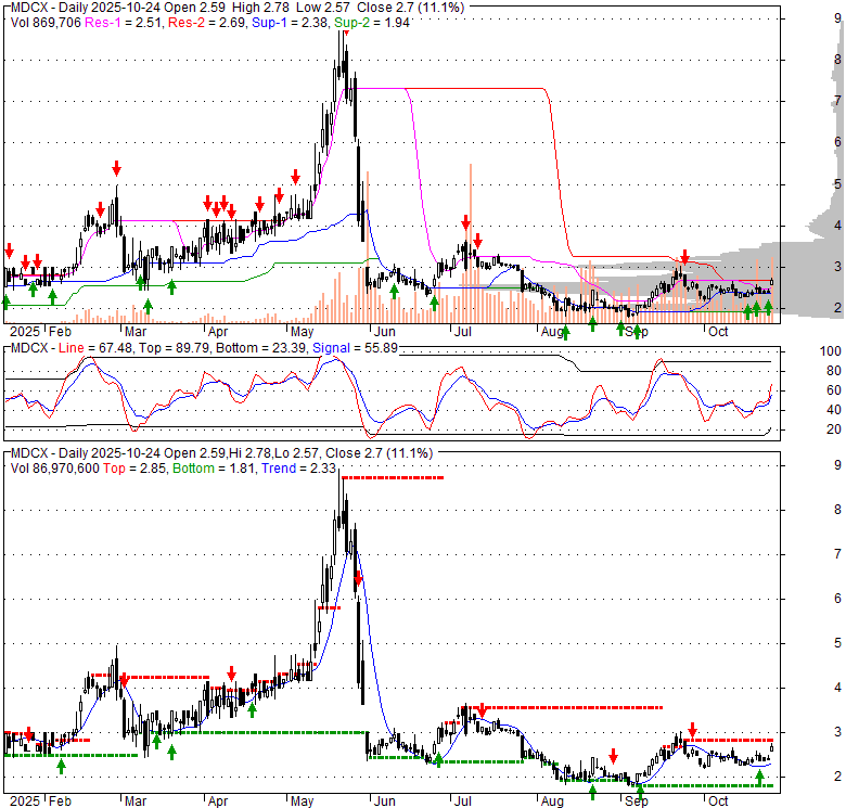 Price has closed above its short-term moving average. Short-term moving average is currently above mid-term; and below long-term moving average. From the relationship between price and moving averages: This stock is BULLISH in short-term; and NEUTRAL in mid-long term.[ MDCX ] has closed above the upper band by 18.8%. If price is in a uptrend band; this upward trend in price might continue. However a short term pullback inside the band is likely.Bollinger Bands are 72.4% narrower than normal. The narrow width of the bands suggests low volatility as compared to its normal range. The bands have been in this narrow range for 22 bars. This is a sign that the market may be about to initiate a new trend.