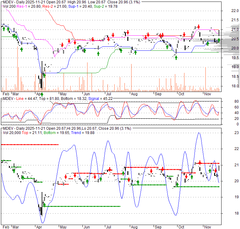 Price has closed above its short-term moving average. Short-term moving average is currently above mid-term; and above long-term moving average. From the relationship between price and moving averages: This stock is BULLISH in short-term; and BULLISH in mid-long term.[ MDEV ] has closed below upper band by 12.3%. Bollinger Bands are 10.3% narrower than normal. The current width of the bands does not suggest anything about the future direction or movement of prices.