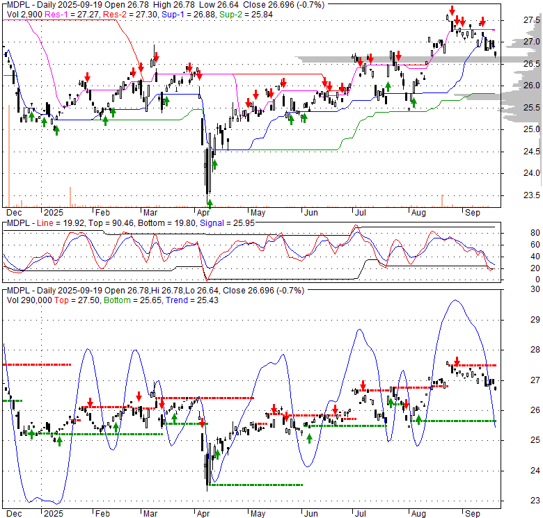 Price has closed above its short-term moving average. Short-term moving average is currently below mid-term; and above long-term moving average. From the relationship between price and moving averages: This stock is NEUTRAL in short-term; and NEUTRAL in mid-long term.[ MDPL ] has closed below upper band by 12.4%. Bollinger Bands are 39.9% narrower than normal. The current width of the bands does not suggest anything about the future direction or movement of prices.