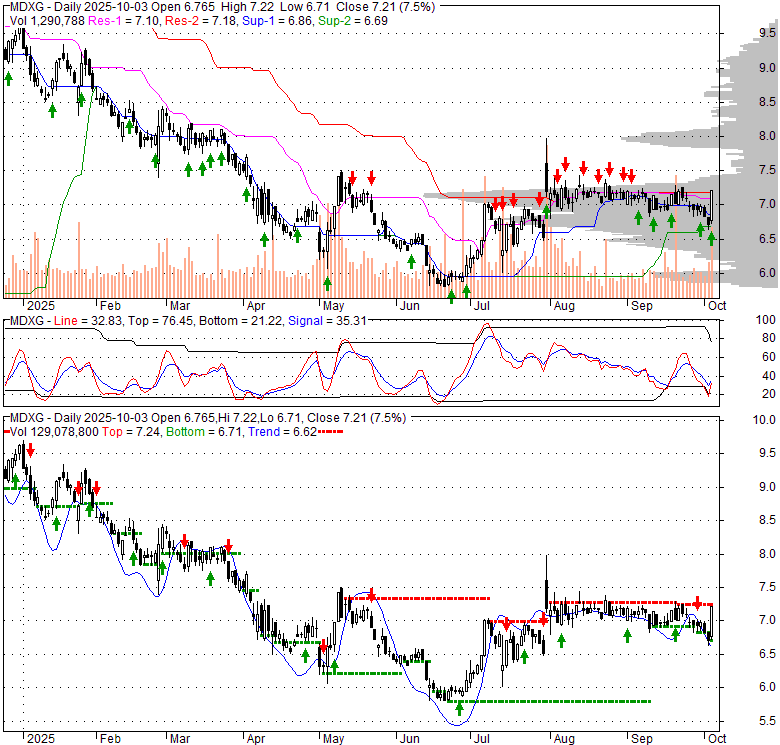 Price has closed above its short-term moving average. Short-term moving average is currently below mid-term; and above long-term moving average. From the relationship between price and moving averages: This stock is NEUTRAL in short-term; and NEUTRAL in mid-long term.[ MDXG ] has closed below upper band by 9.7%. Bollinger Bands are 34.6% narrower than normal. The current width of the bands does not suggest anything about the future direction or movement of prices.
