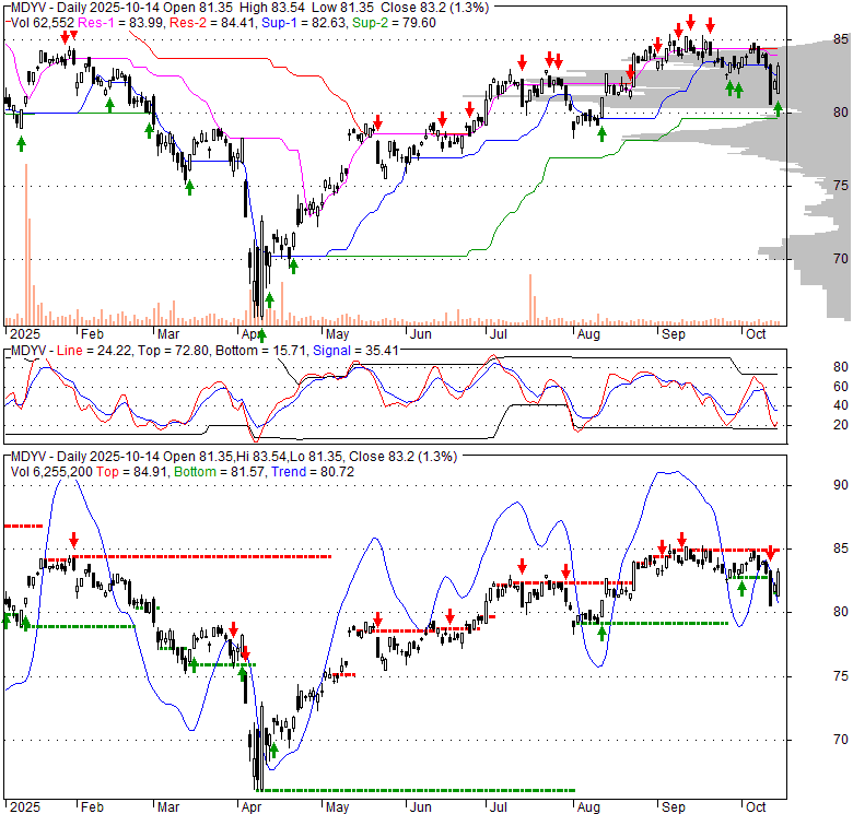 Price has closed above its short-term moving average. Short-term moving average is currently below mid-term; and above long-term moving average. From the relationship between price and moving averages: This stock is NEUTRAL in short-term; and NEUTRAL in mid-long term.[ MDYV ] has closed above bottom band by 48.0%. Bollinger Bands are 4.2% narrower than normal. The current width of the bands does not suggest anything about the future direction or movement of prices.