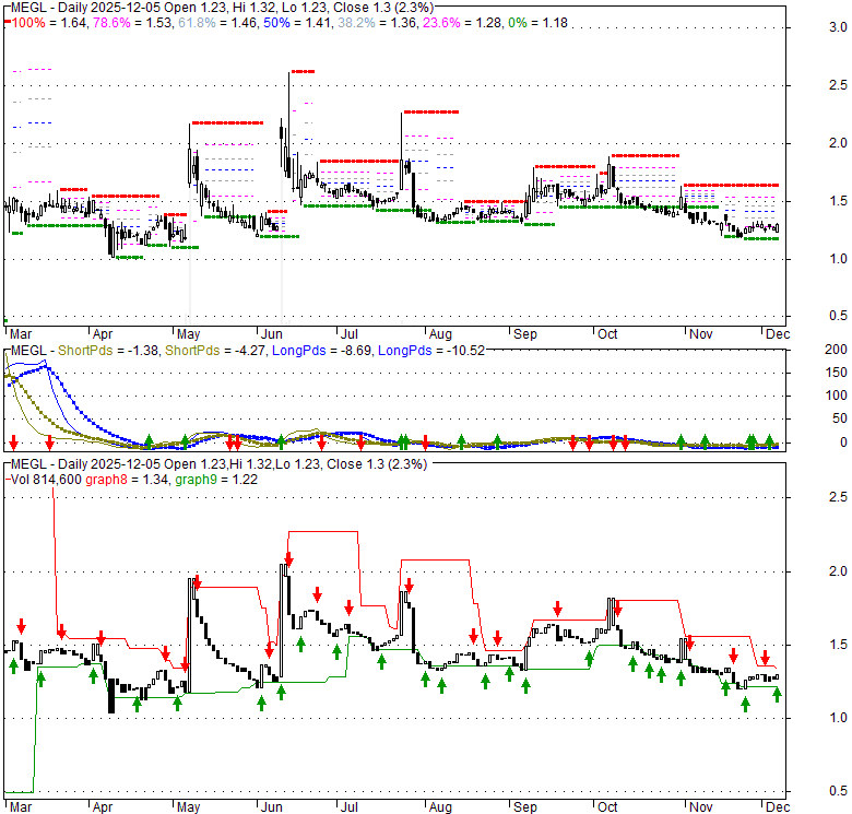 Price has closed above its short-term moving average. Short-term moving average is currently below mid-term; and below long-term moving average. From the relationship between price and moving averages: This stock is NEUTRAL in short-term; and BEARISH in mid-long term.[ MEGL ] has closed below upper band by 33.1%. Bollinger Bands are 49.1% narrower than normal. The narrow width of the bands suggests low volatility as compared to its normal range. The bands have been in this narrow range for 5 bars. This is a sign that the market may be about to initiate a new trend.