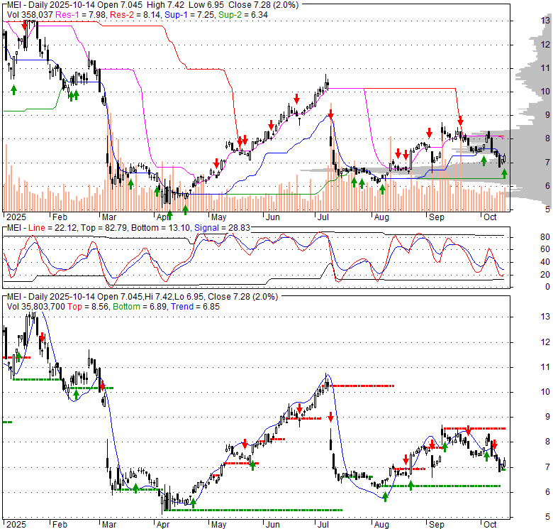 Price has closed above its short-term moving average. Short-term moving average is currently below mid-term; and below long-term moving average. From the relationship between price and moving averages: This stock is NEUTRAL in short-term; and BEARISH in mid-long term.[ MEI ] has closed above bottom band by 31.0%. Bollinger Bands are 32.8% narrower than normal. The current width of the bands does not suggest anything about the future direction or movement of prices.