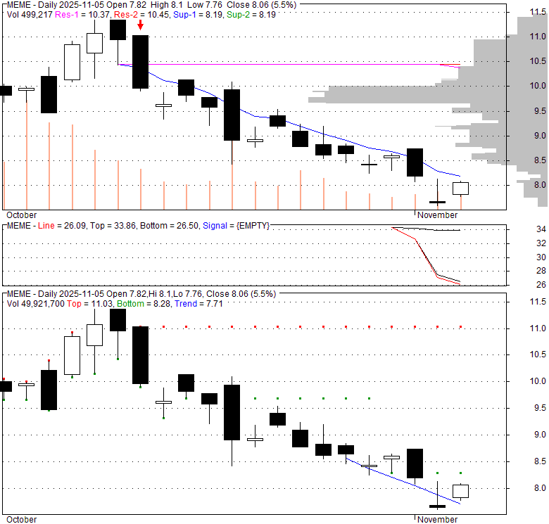 Price has closed below its short-term moving average. Short-term moving average is currently below mid-term; and below long-term moving average. From the relationship between price and moving averages: This stock is NEUTRAL in short-term; and NEUTRAL in mid-long term.[ MEME ] has closed above bottom band by 19.0%. Bollinger Bands are 0% narrower than normal.