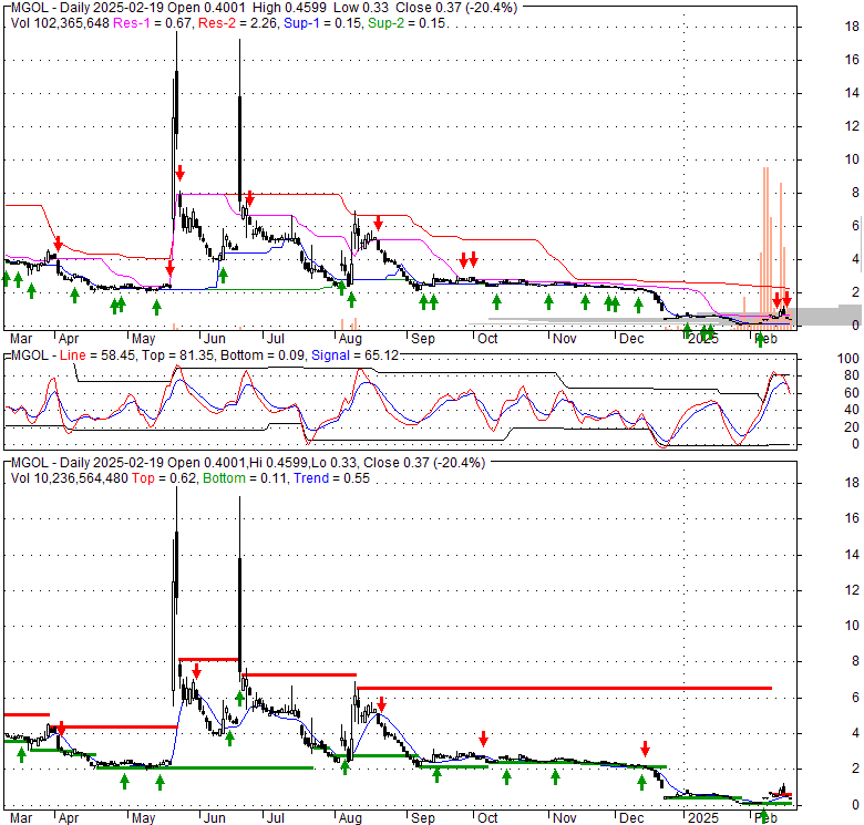 Price has closed below its short-term moving average. Short-term moving average is currently below mid-term; and below long-term moving average. From the relationship between price and moving averages: This stock is BEARISH in short-term; and BEARISH in mid-long term.[ MGOL ] has closed above bottom band by 48.2%. Bollinger Bands are 29.6% wider than normal. The current width of the bands does not suggest anything about the future direction or movement of prices.
