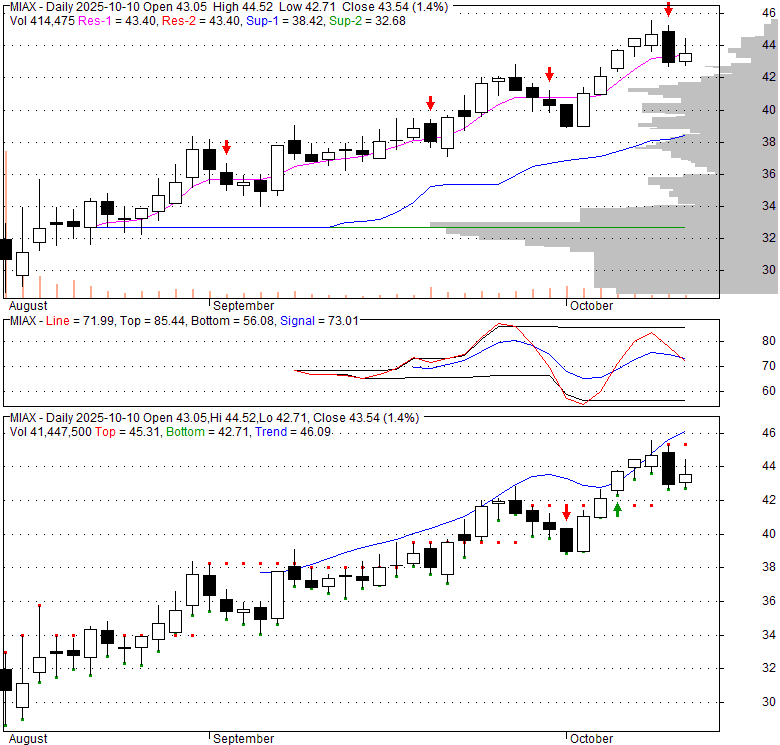 Price has closed below its short-term moving average. Short-term moving average is currently below mid-term; and below long-term moving average. From the relationship between price and moving averages: This stock is NEUTRAL in short-term; and NEUTRAL in mid-long term.[ MIAX ] has closed below upper band by 24.4%. Bollinger Bands are 0% narrower than normal.