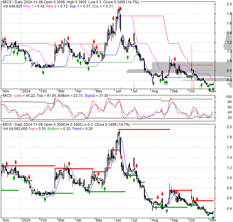 Price has closed above its short-term moving average. Short-term moving average is currently below mid-term; and below long-term moving average. From the relationship between price and moving averages: This stock is NEUTRAL in short-term; and BEARISH in mid-long term.[ MICS ] has closed below upper band by 47.1%. Bollinger Bands are 51.6% narrower than normal. The narrow width of the bands suggests low volatility as compared to its normal range. The bands have been in this narrow range for 5 bars. This is a sign that the market may be about to initiate a new trend.