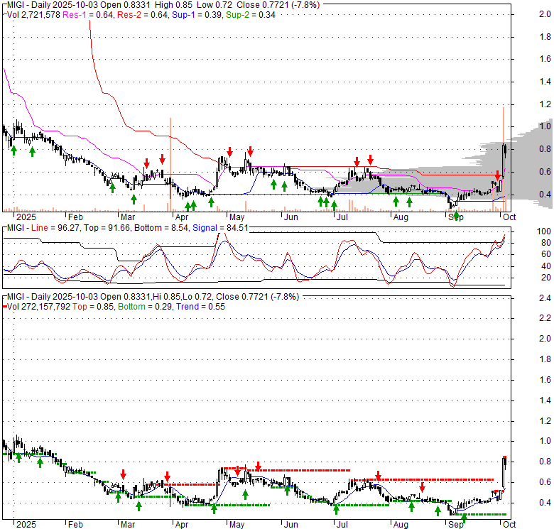Price has closed above its short-term moving average. Short-term moving average is currently above mid-term; and above long-term moving average. From the relationship between price and moving averages: This stock is BULLISH in short-term; and NEUTRAL in mid-long term.[ MIGI ] has closed above the upper band by 4.4%. If price is in a uptrend band; this upward trend in price might continue. However a short term pullback inside the band is likely.Bollinger Bands are 190.8% wider than normal. The large width of the bands suggest high volatility as compared to its normal range. The bands have been in this wide range for 1 days. This is a sign that the current trend might continue.