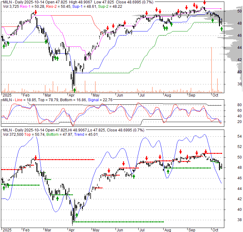 Price has closed above its short-term moving average. Short-term moving average is currently below mid-term; and below long-term moving average. From the relationship between price and moving averages: This stock is NEUTRAL in short-term; and NEUTRAL in mid-long term.[ MILN ] has closed above bottom band by 44.4%. Bollinger Bands are 15.4% wider than normal. The current width of the bands does not suggest anything about the future direction or movement of prices.