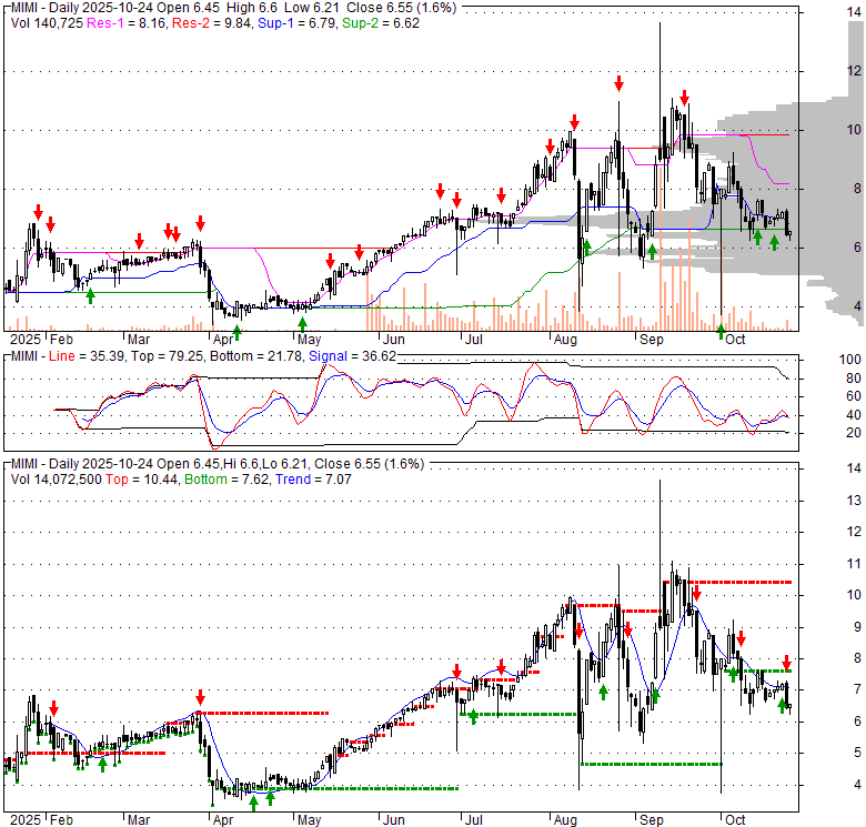 Price has closed below its short-term moving average. Short-term moving average is currently below mid-term; and below long-term moving average. From the relationship between price and moving averages: This stock is BEARISH in short-term; and NEUTRAL in mid-long term.[ MIMI ] has closed above bottom band by 19.4%. Bollinger Bands are 35% narrower than normal. The current width of the bands does not suggest anything about the future direction or movement of prices.