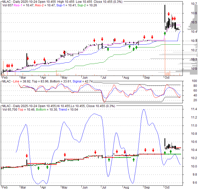 Price has closed below its short-term moving average. Short-term moving average is currently above mid-term; and above long-term moving average. From the relationship between price and moving averages: This stock is NEUTRAL in short-term; and BULLISH in mid-long term.[ MLAC ] has closed above bottom band by 25.8%. Bollinger Bands are 8% wider than normal. The current width of the bands does not suggest anything about the future direction or movement of prices.