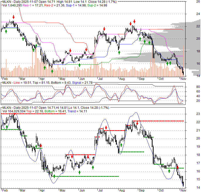Price has closed below its short-term moving average. Short-term moving average is currently below mid-term; and below long-term moving average. From the relationship between price and moving averages: This stock is BEARISH in short-term; and BEARISH in mid-long term.[ MLKN ] has closed above bottom band by 5.1%. Bollinger Bands are 37.3% wider than normal. The current width of the bands does not suggest anything about the future direction or movement of prices.
